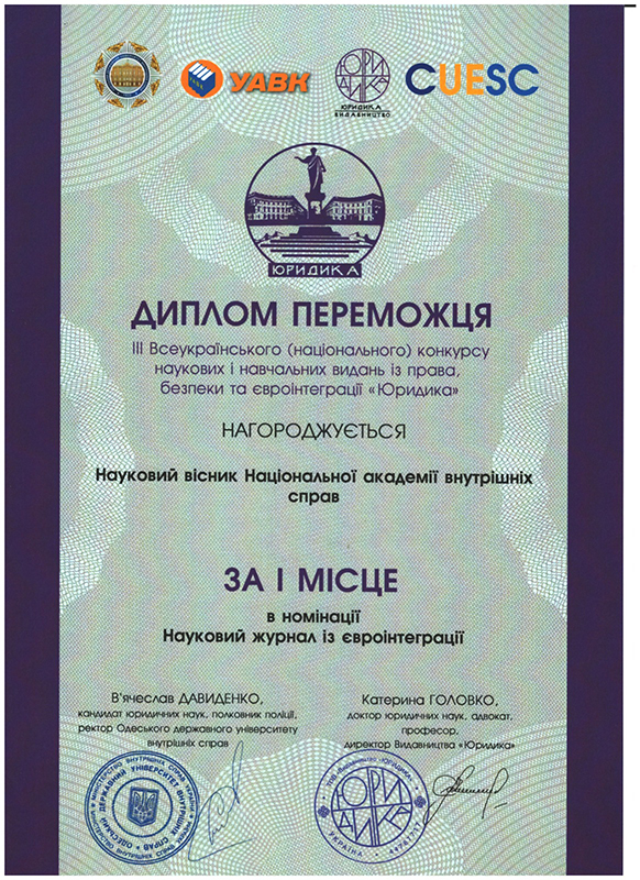 • «Scientific Journal of the National Academy of Internal Affairs» («Науковий вісник Національної академії внутрішніх справ») (з юридичних наук);