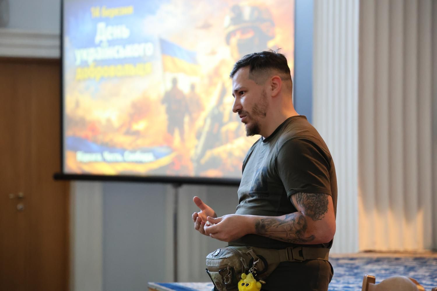 На початку заходу присутні вшанували хвилиною мовчання пам’ять захисників та захисниць України, які віддали життя за незалежність, суверенітет і територіальну цілісність держави. Ветеран розповів про свій життєвий і бойовий шлях, виклики, які довелося долати після поранення.