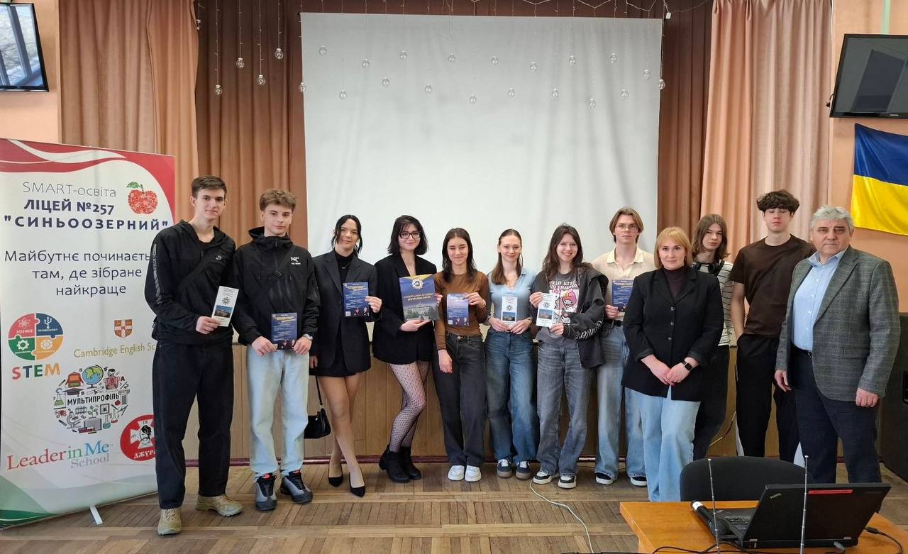 У межах профорієнтаційної роботи Національної академії внутрішніх справ відбулася змістовна зустріч доктора історичних наук, професора Володимира Щербатюка, провідного фахівця відділення профорієнтації, практики та працевлаштування навчально-наукового інституту права та психології Світлани Ратошнюк, голови парламенту курсантсько-студентського самоврядування НАВС капрала поліції Тимура Меджидова та здобувачів вищої освіти за спеціальністю «Право» Дарії Луценко, Ксенії Постолюк, Вероніки Ященко з учнями та вчителями ліцею № 257 «Синьоозерний» Подільського району міста Києва.