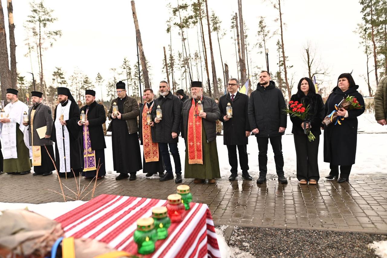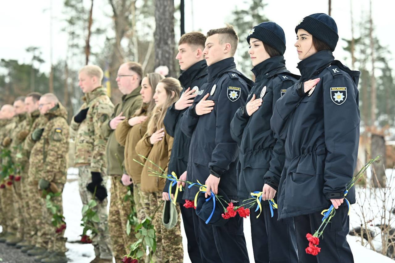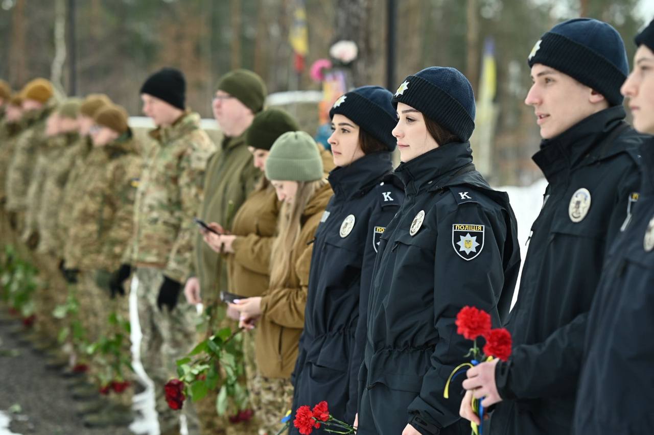 У селі Мощун курсанти Національної академії внутрішніх справ разом із головою Київської обласної державної адміністрації взяли участь у церемонії покладання квітів і встановлення лампадок, а також у спільній молитві за участю військових капеланів.